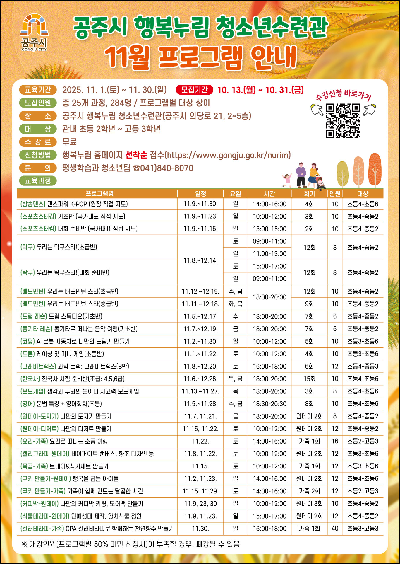 | 접수기간 | 2025-10-13 10:00 ~ 2025-10-31 18:00 | 지역 | 공주시전체 |
