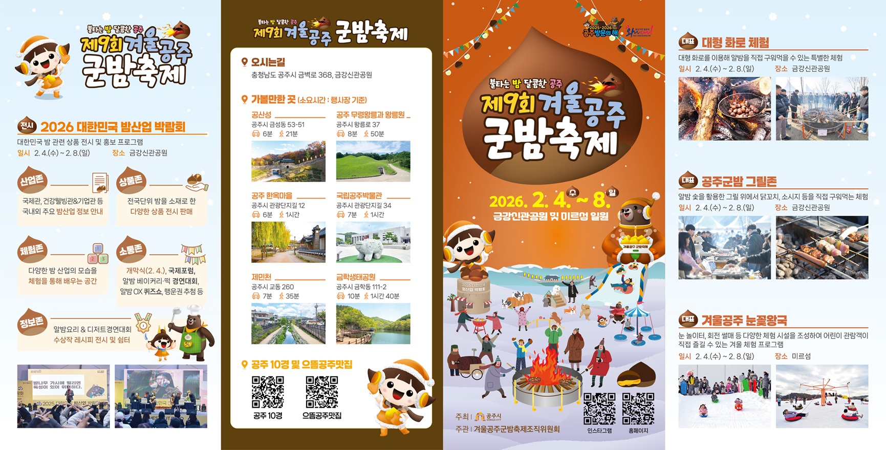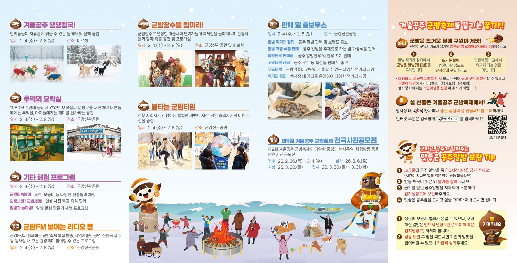· 축제기간 : 2026. 2. 4.(수) ~ 2. 8.(일) · 장 소 : 금강신관공원 및 미르섬 일원· 주최/주관 : 공주시/겨울공주군밤축제 조직위원회· 주요내용 : 대형화로군밤굽기, 군밤그릴존, 알밤 및 가공식품 판매, 알밤 체험부스, 겨울공주 눈꽃왕국(눈 놀이터) 등